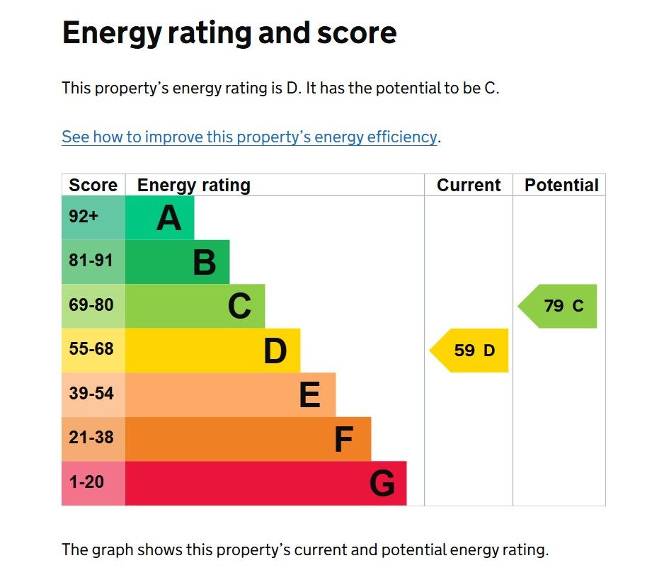Tenure: Freehold. Council Tax: band B. EPC: band D59 with a potential for a C79. Tenure: Freehold. Mains gas, water, electricity and drainage are connected.